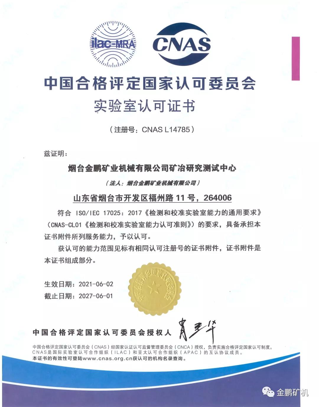 近日,煙臺金鵬業機械有限公司礦冶研究測試中心成功通過了中國合格評定國家認可委員會(下稱CNAS)的審核,并獲得實驗室認可證書。標志著金鵬礦機礦冶研究測試中心的質量管理體系完全符合國際標準,技術能力達到了國際化先進水平。