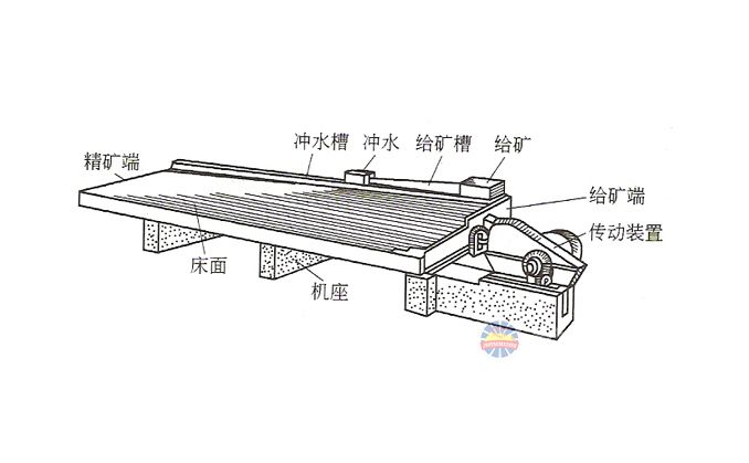 搖床分選是在床面和橫向水流的共同作用下實現(xiàn)的,床面上床條或刻槽是縱向的,與水流方向近于垂直,水流橫向流過時在溝槽內(nèi)形成渦流,渦流和床面搖動的共同作用可使礦砂層松散并按密度分層,重礦物轉(zhuǎn)向下層,輕礦物轉(zhuǎn)向上層,稱此過程為“析離層”,上層輕礦粒受到水流較大沖力,而下層重礦粒則受較小沖力,因此輕礦粒在床面上橫向運動速度大于重礦粒在床面上的橫向運動速度。在縱向,床面的差動運動不僅促進礦砂層松散分層,而且使重礦粒以較大速度沿縱向向前運動,使輕礦粒以較小速度向前運動。礦粒的去向,取決于縱向速度和橫向速度的合成速度。重礦物具有較小的橫向速度和較大的縱向速度,輕礦物具有較大的橫向速度和較小的縱向速度,應(yīng)用平行四邊形法則把縱向和橫向速度合成,可以看到,重礦物的合速度偏向搖床的精礦排礦端,輕礦物偏向搖床尾礦側(cè),中等密度的顆粒則位于二者之問,稱此過程為“運搬分帶”。
